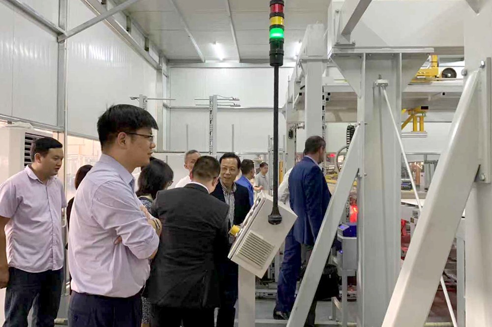 ↑IOS/安卓通用版/手机APP下载集团总经理罗山鹰、副总经理兼制造总监邝越华,带领爱格集团CFO及发言人Thomas Lessing一行,参观了无锡制造基地生产线。