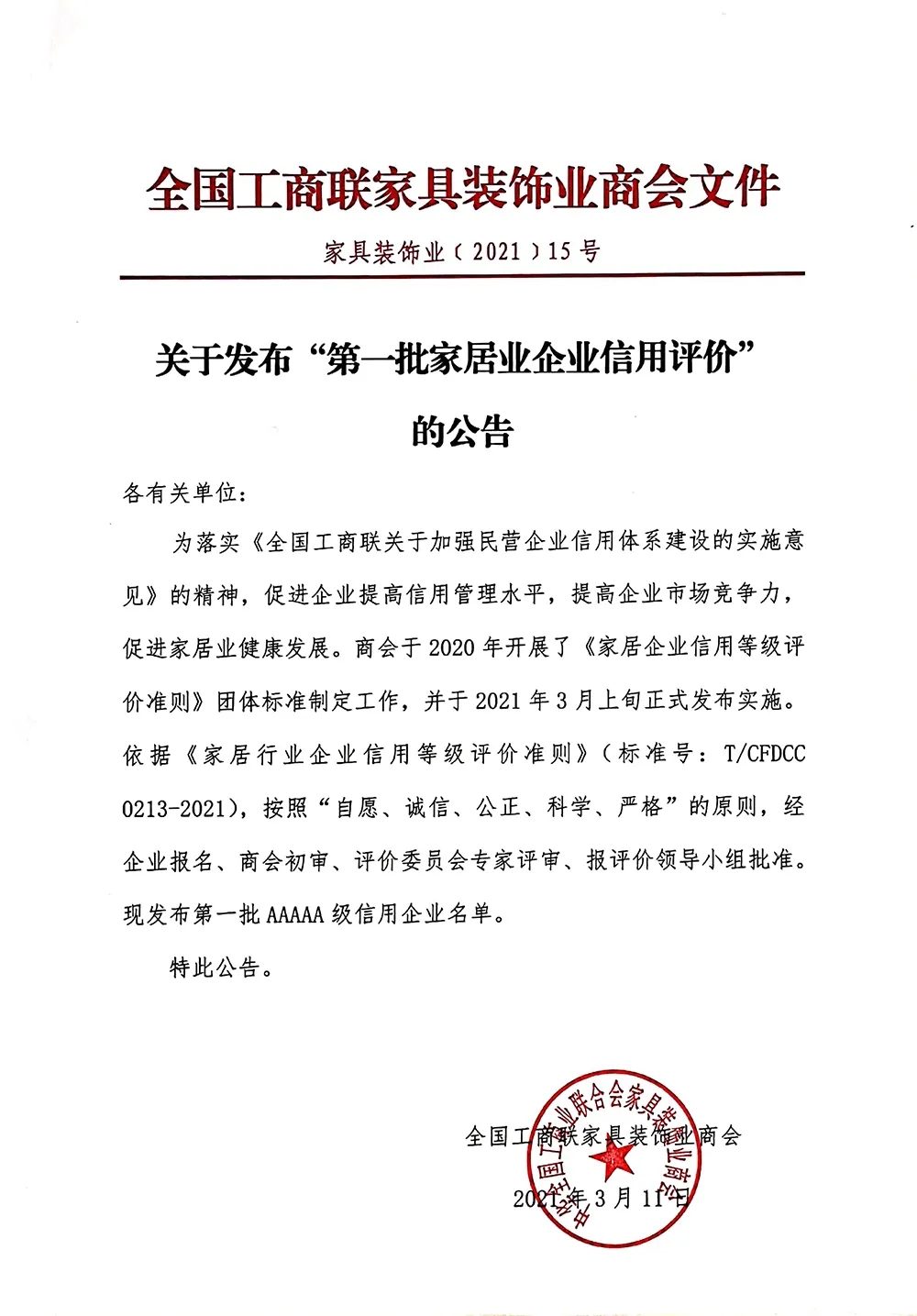 近日,IOS/安卓通用版/手机APP下载公司被全国工商联家具装饰业商会评选为首批“家居业信用评价AAAAA级企业”,这是对IOS/安卓通用版/手机APP下载公司的企业经营信用的肯定,也是对IOS/安卓通用版/手机APP下载公司的质量、技术、品牌、生产、营销、社会责任等多方面实力的赞许。