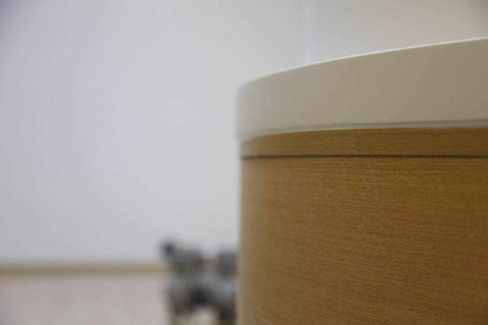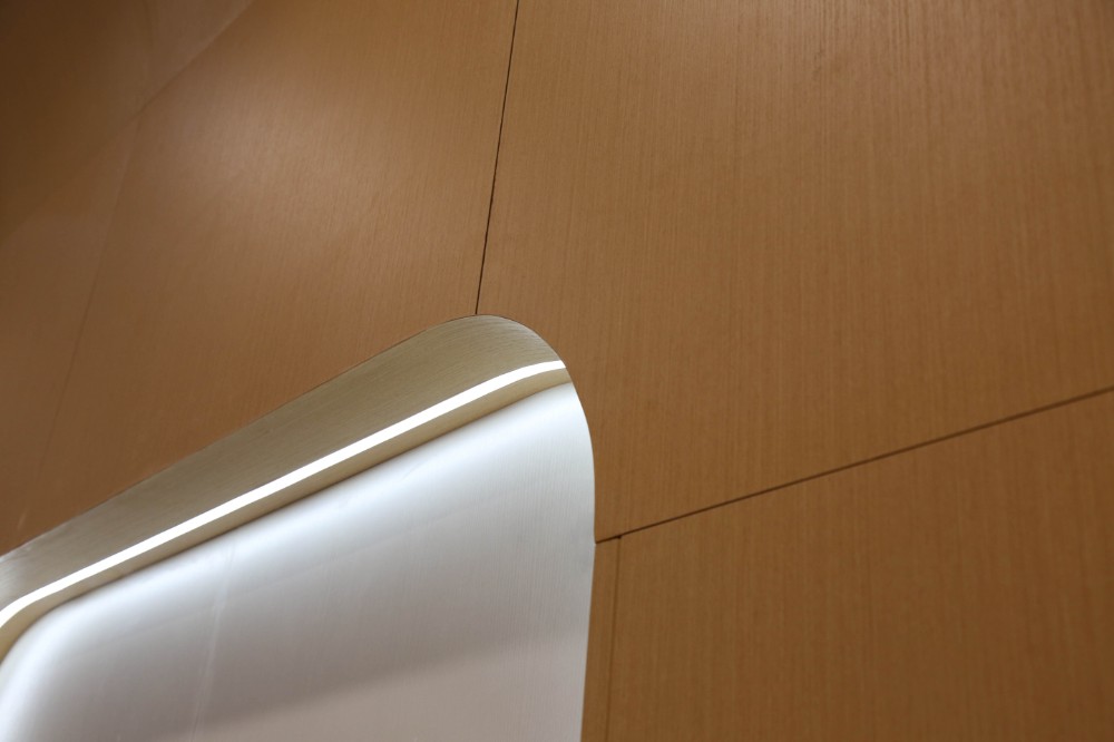 使用原木色系的岩金板做护墙板以及异形造型,