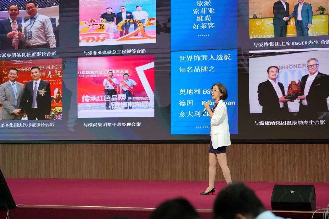 吴惠娟副总经理以“智造高端饰面板 助推绿色家居高质量发展”为主题,从“企业简介”、“从饰面板、家居产业链谈高质量发展与企业家精神”两方面论证主题,最终以高端饰面板品牌方的角度传达了对未来绿色家居生态链的展望,赢得了在场会员代表的点赞!