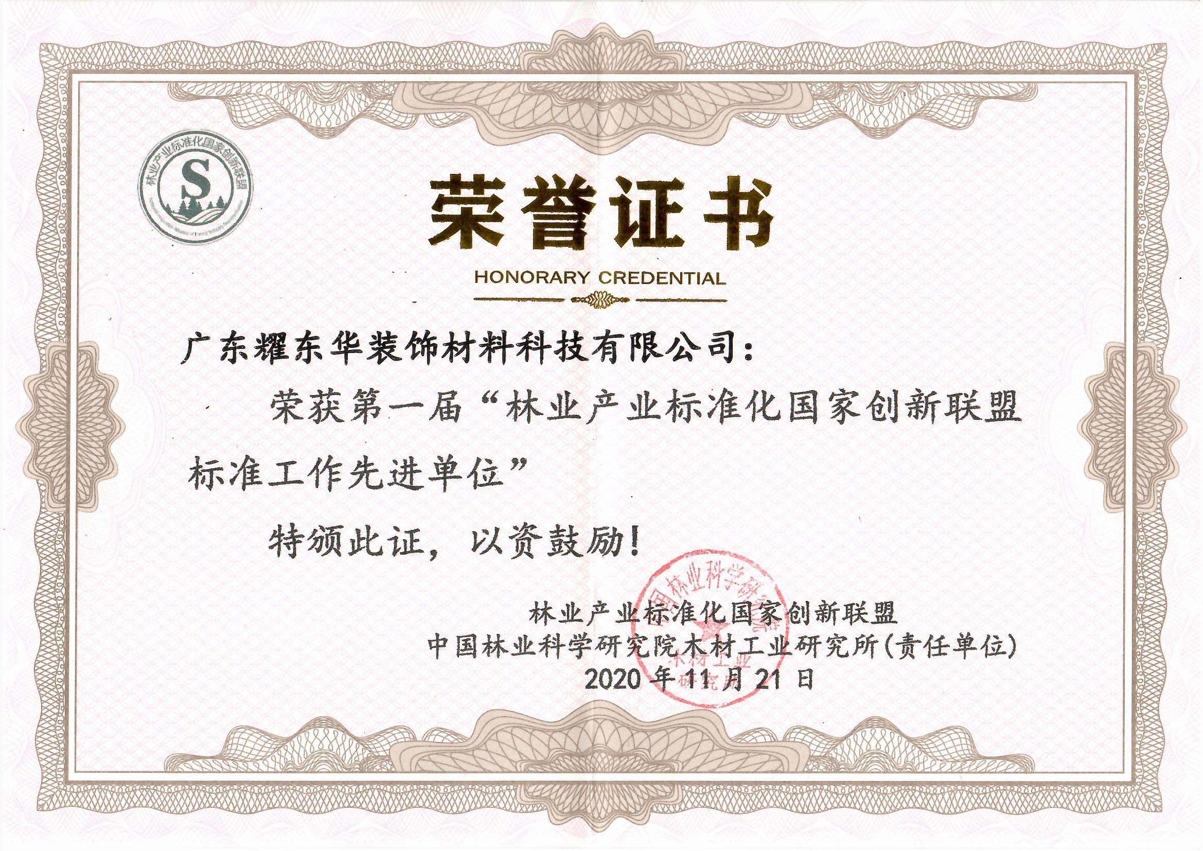 标准工作先进单位证书