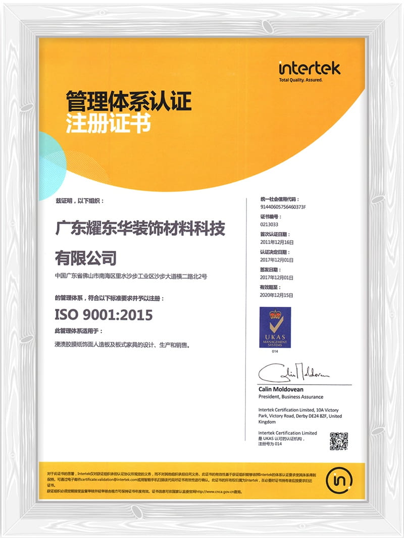 ISO质量管理体系认证书(中文版)